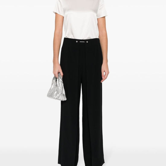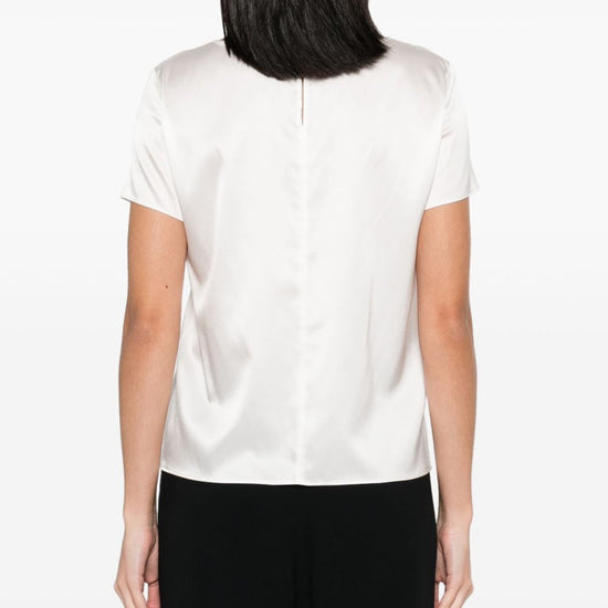 White stretch-silk satin weave round neck short sleeves straight hem single rear button fastening with fabric-covered button silk top