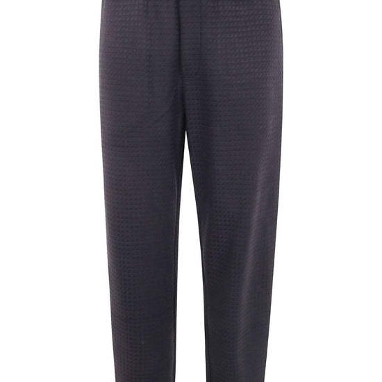 Dark grey textured weave elasticated waistband cuffed hems two rear pockets logo patch cotton sweatpants