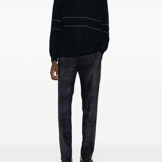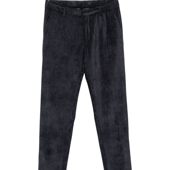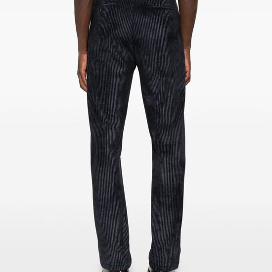 Blue concealed front button, hook and zip fastening rear elasticated waistband two side inset pockets two rear button-fastening jetted pockets