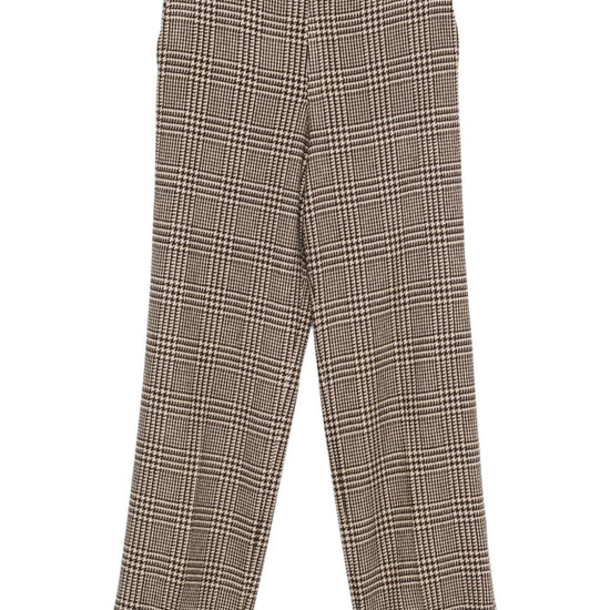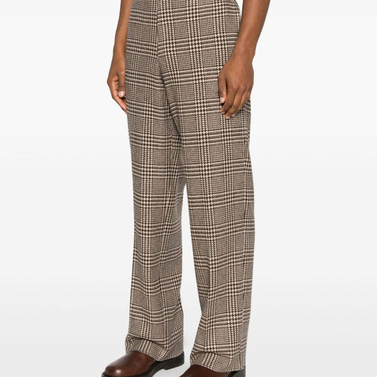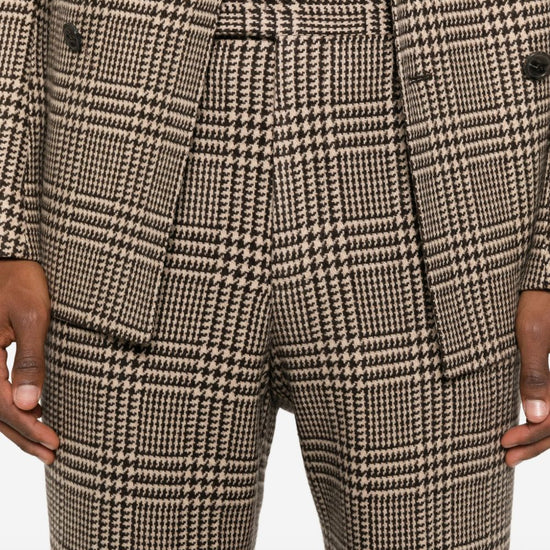 Brown houndstooth pattern hook, button and zip fastening wool trousers