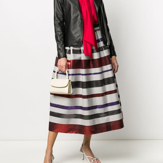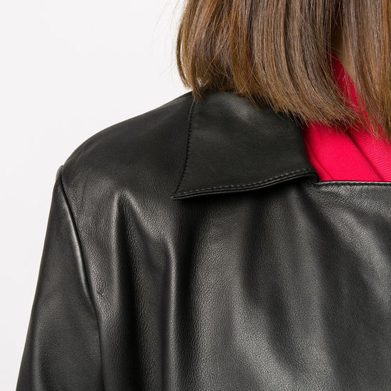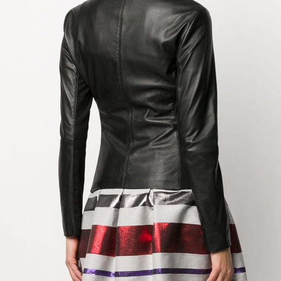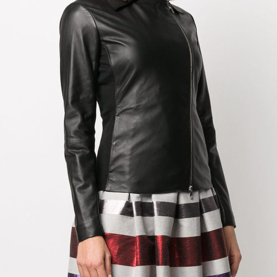 Lack leather zipped biker jacket from emporio armani featuring an off-centre front zip fastening, panelled long sleeves, contrasting panels and a slim fit. leather jacket size and fit - this piece fits true to size. we recommend you get your regular size. model is 1,75m / 5ft 8in wearing size 40 (it)