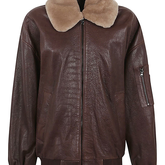Dark brown colour, solid colour, made of leather, collar with fur, long sleeves with cuff, front zip closure, raised stitching for decoration, two side welt pockets, patch pocket on the left sleeve with zip closure, internal lining, straight hem. vivienne leather jacket size and fit - this piece fits true to size. we recommend you get your regular size. model is 1,75m / 5ft 8in wearing size 36 (fr)