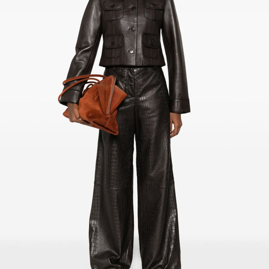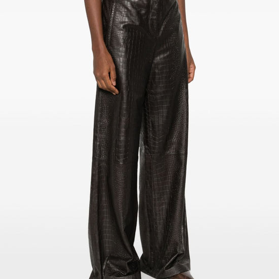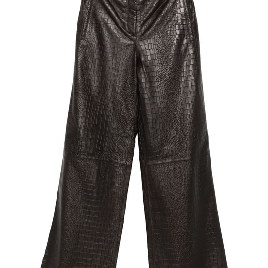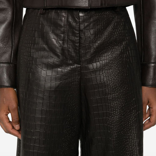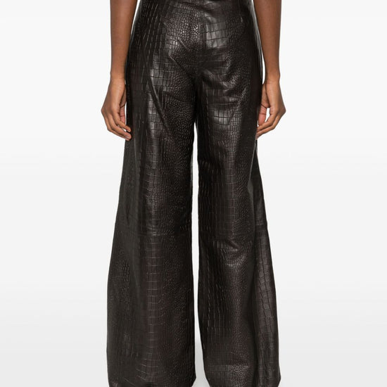 Brown crocodile effect wide leg high waist zip fly front welt pockets leather trousers