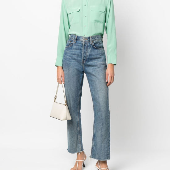 Long-sleeve silk shirt from equipment featuring mint green, silk, classic collar, two chest flap pockets, front button fastening, long sleeves and curved hem. silk shirt size and fit - this piece fits true to size. we recommend you get your regular size. model is 1,75m / 5ft 8in wearing size s