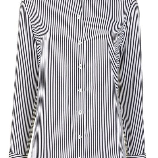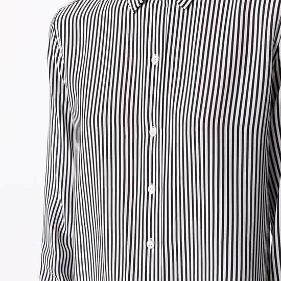 White/blue silk vertical stripe pattern classic collar front button fastening long sleeves striped silk shirt size and fit - this piece fits true to size. we recommend you get your regular size. model is 1,75m / 5ft 8in wearing size s