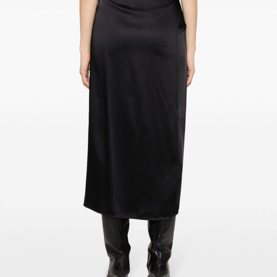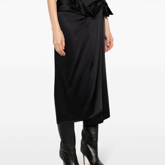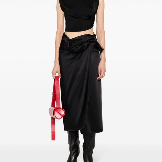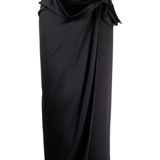 Draped satin wrap skirt from erika cavallini featuring black, satin finish, draped design, high-waisted, wrap design, side tie fastening and mid-length. loryan long skirt size and fit - this piece fits true to size. we recommend you get your regular size. model is 1,75m / 5ft 8in wearing size 40 (it)