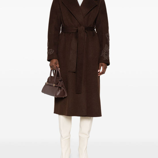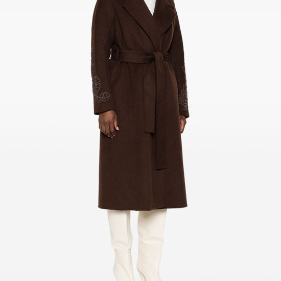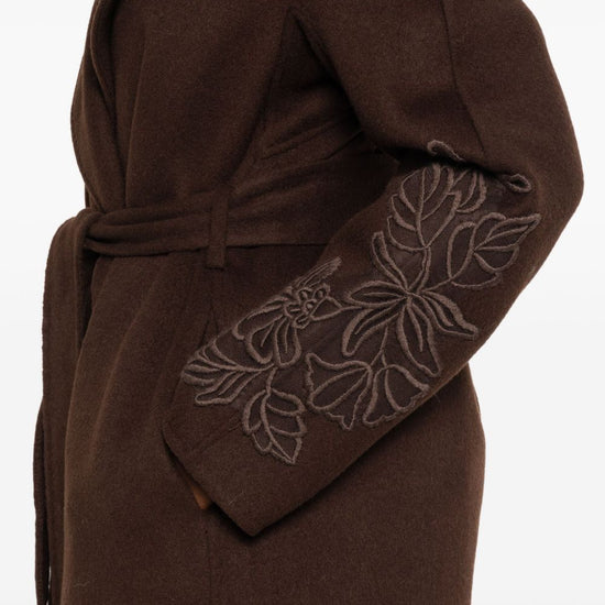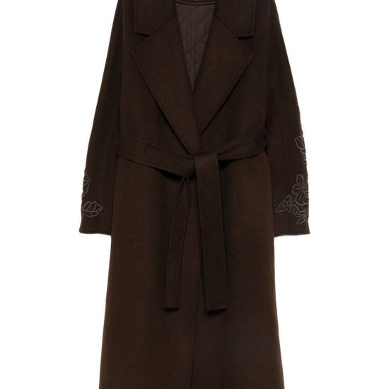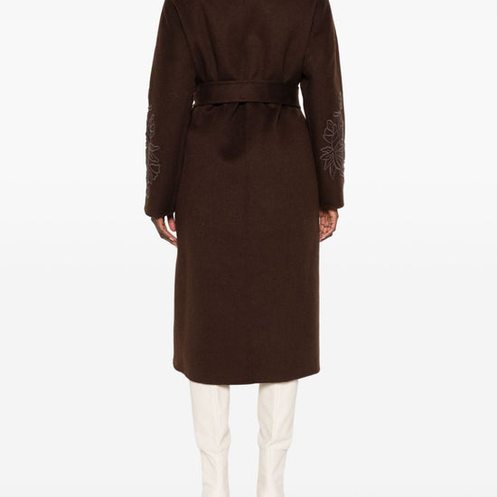 Brown floral embroidery belted waist notched lapels long sleeves double-breasted design belted long coat