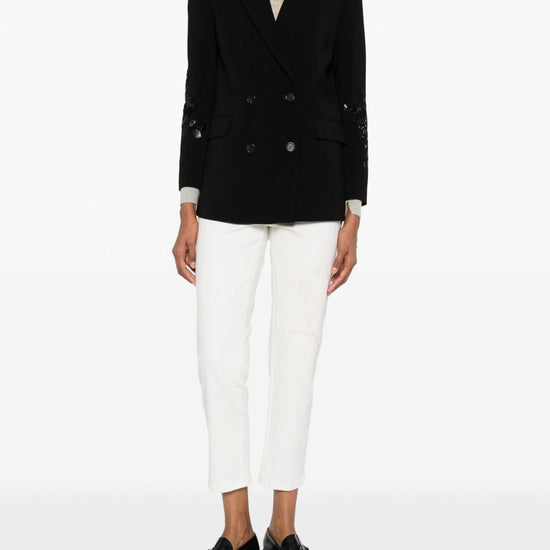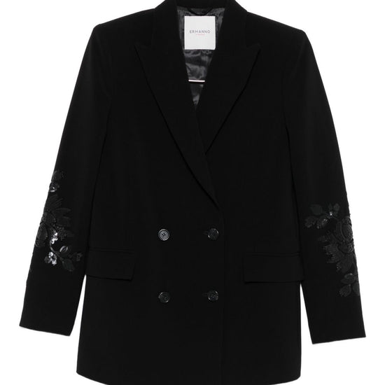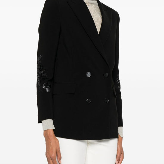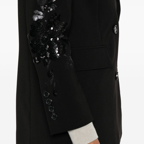 Black sequin embellishment front button fastening long sleeves side flap pockets embroidered double-breasted jacket