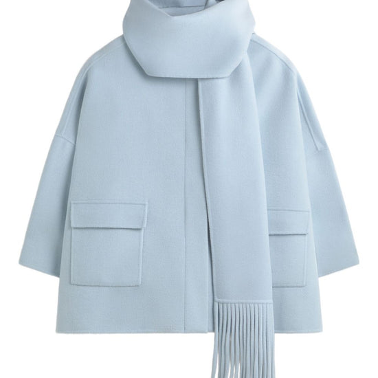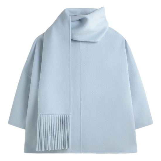 Blue high neck scarf details fringed trim patch pockets wool scarfed cape