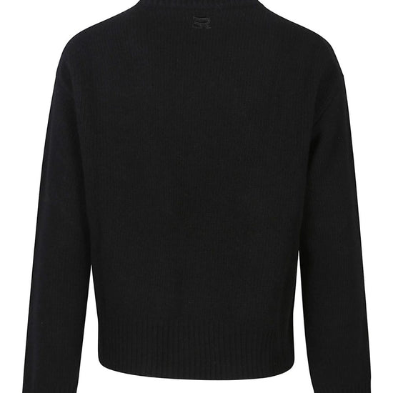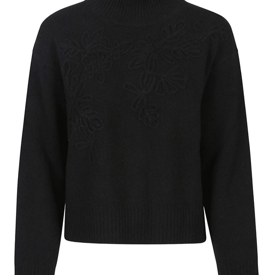 Black high neck long sleeves floral embroidery ribbed hem wool high-neck sweater