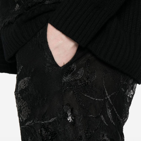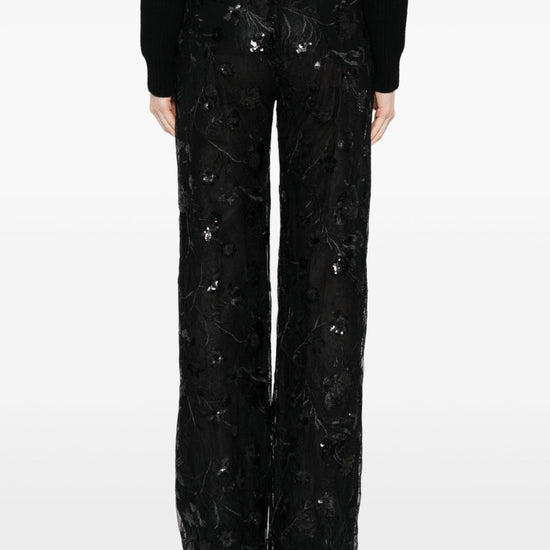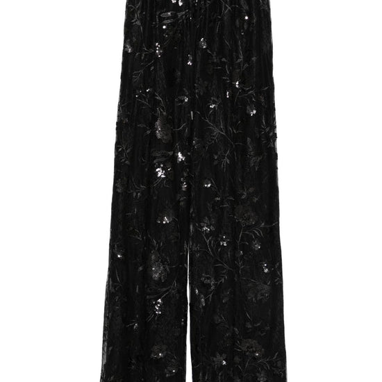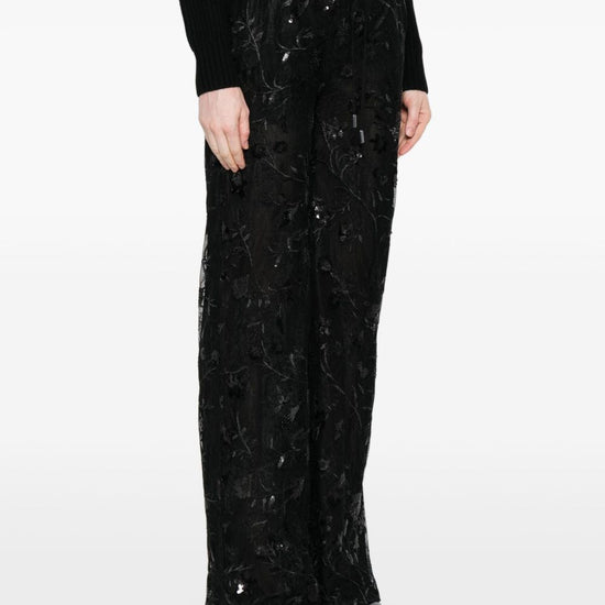 Black sequin embellishment floral pattern elasticated waistband wide leg sequined trousers