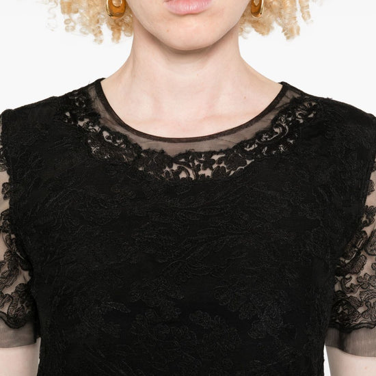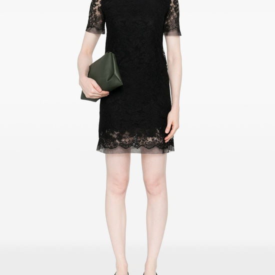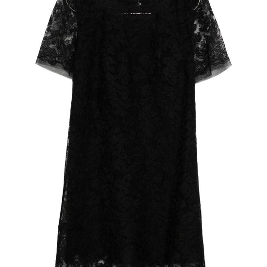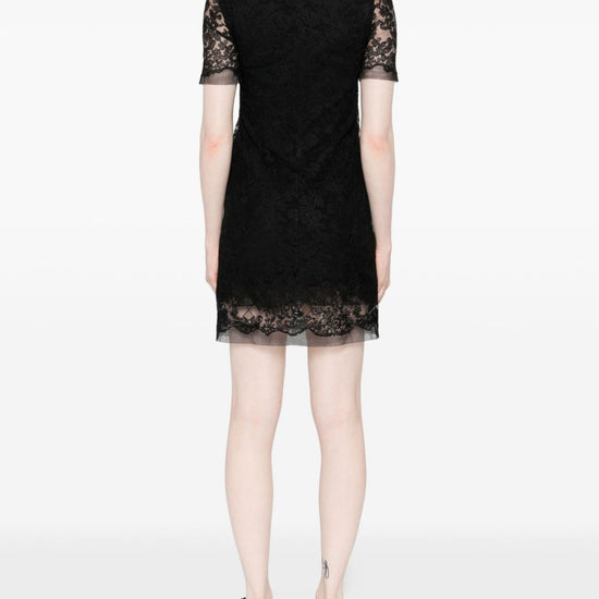 Black floral lace short sleeves round neck back zip-fastening lace short dress
