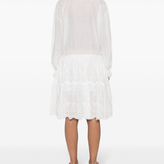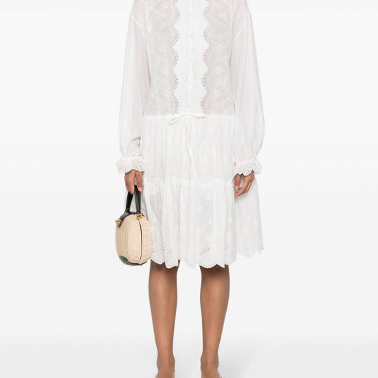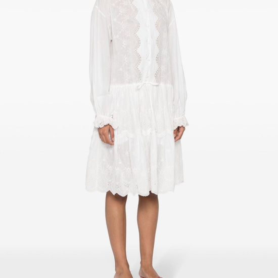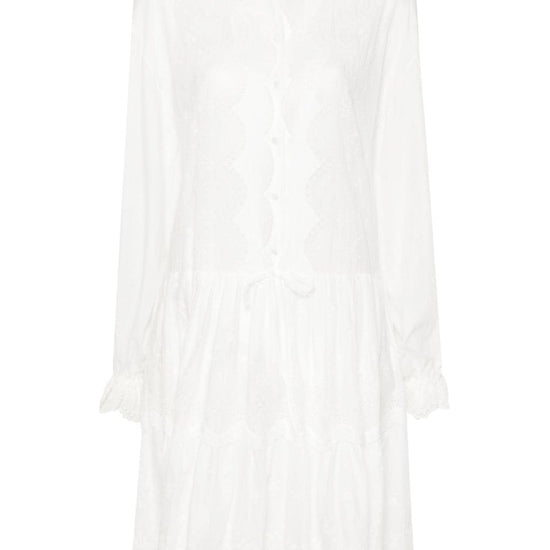 Off-white cotton floral embroidery scallop collar long sleeves elasticated cuffs fabric-covered buttons drawstring waist ruffled panels internal logo tag thigh-length front button placket embroidered shirt dress size and fit - this piece fits true to size. we recommend you get your regular size. model is 1,75m / 5ft 8in wearing size 40 (it)
