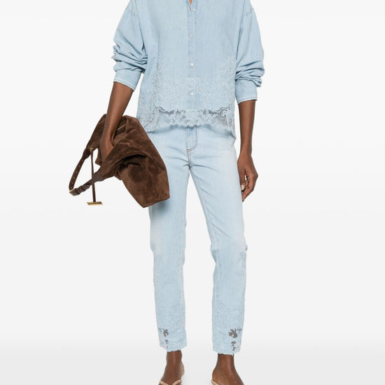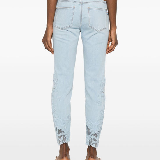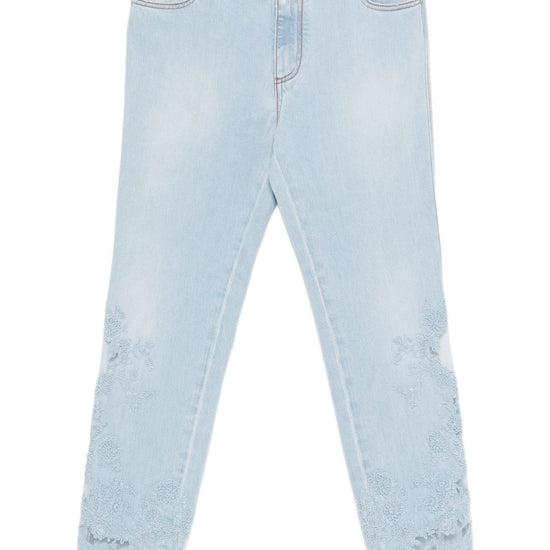 Light blue lace detail contrast stitching five pockets embroidered denim jeans