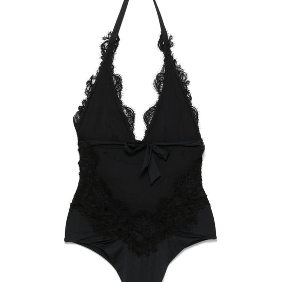 Black halterneck tie fastening rear tie fastening v-neck be mindful to try on swimwear over your own garments. lace detail swimsuit size and fit - this piece fits true to size. we recommend you get your regular size. model is 1,75m / 5ft 8in wearing size 1 (num)