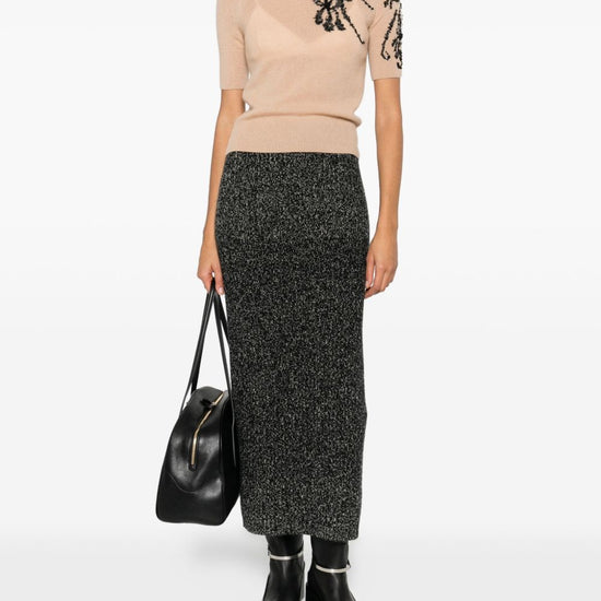 Light brown floral embellishment round neck short sleeves embroidered cashmere sweater