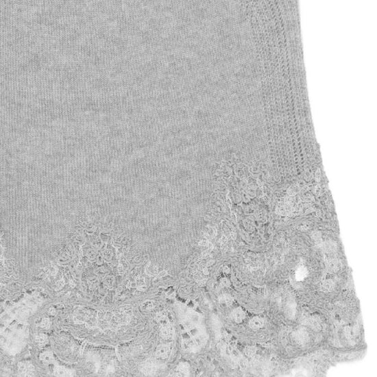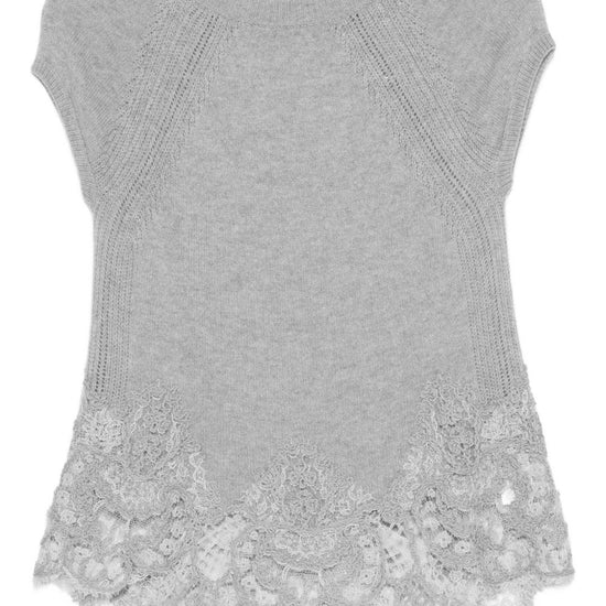 Grey short sleeves round neck knit texture lace trim scalloped hem lace cashmere top