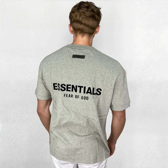 elevate your wardrobe with the essentials x fear of god t-shirt in dark heather oatmeal grey. crafted from soft, breathable cotton, this premium t-shirt delivers lasting comfort and everyday durability. featuring a clean, oversized silhouette and bold fear of god branding across the chest, it blends luxury streetwear with effortless versatility. the dark heather grey colourway makes it an easy match for any outfit, whether styled alone or layered.