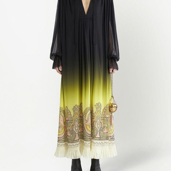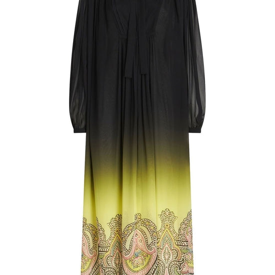 Gradient effect paisley-print silk dress from etro featuring black, lime green, silk, paisley print, gradient effect, front tie fastening, long puff sleeves, shift style and ankle-length. printed silk dress size and fit - this piece fits true to size. we recommend you get your regular size. model is 1,75m / 5ft 8in wearing size 40 (it)