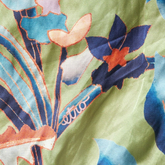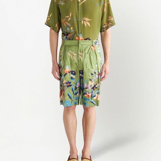 Floral-print deck shorts from etro featuring metallic threading, all-over floral print, front button fastening, belt loops, two diagonal pockets to the sides, two rear flap pockets and green/multicolour. printed shorts size and fit - this piece fits true to size. we recommend you get your regular size. model is 1,84m / 6ft 1in wearing size 48 (it)