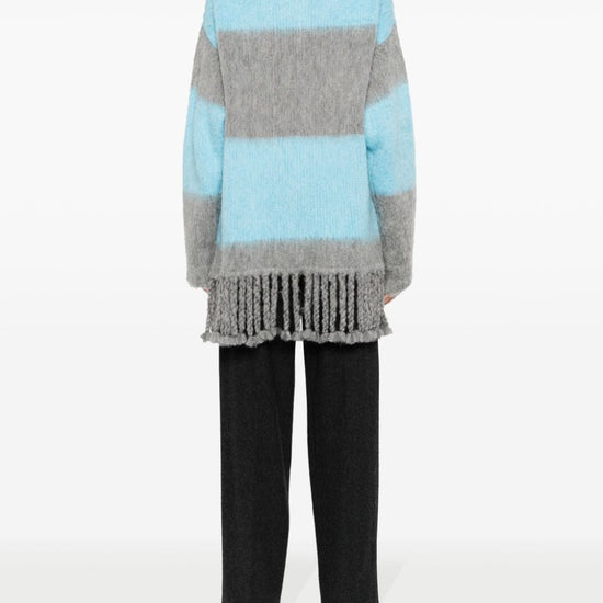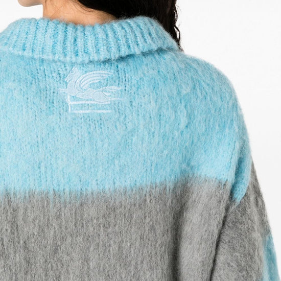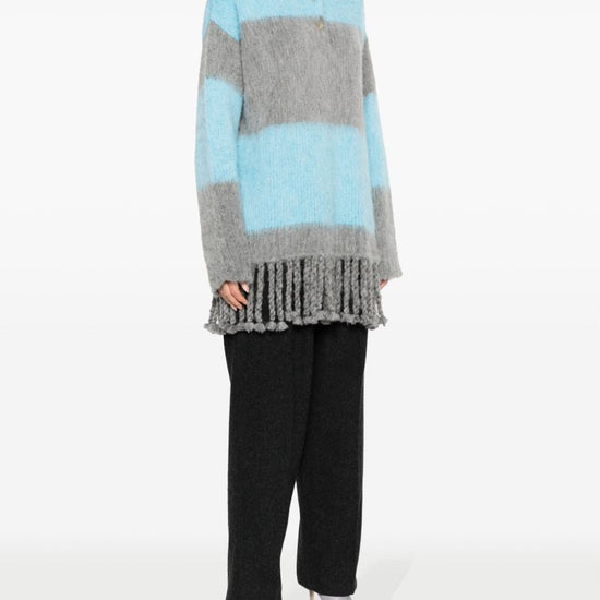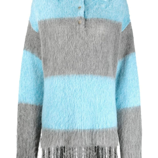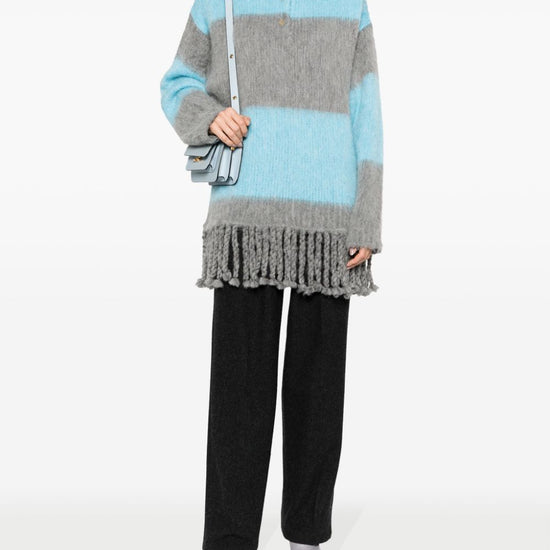 Fringed-edge sweater minidress from etro featuring light blue, grey, ribbed knit, horizontal stripe pattern, brushed effect, signature pegaso motif, embroidered logo to the rear, polo collar, front button placket, long sleeves and fringed edge. striped wool blend polo shirt size and fit - this piece fits true to size. we recommend you get your regular size. model is 1,75m / 5ft 8in wearing size 40 (it)