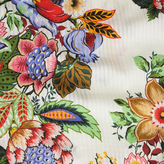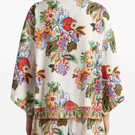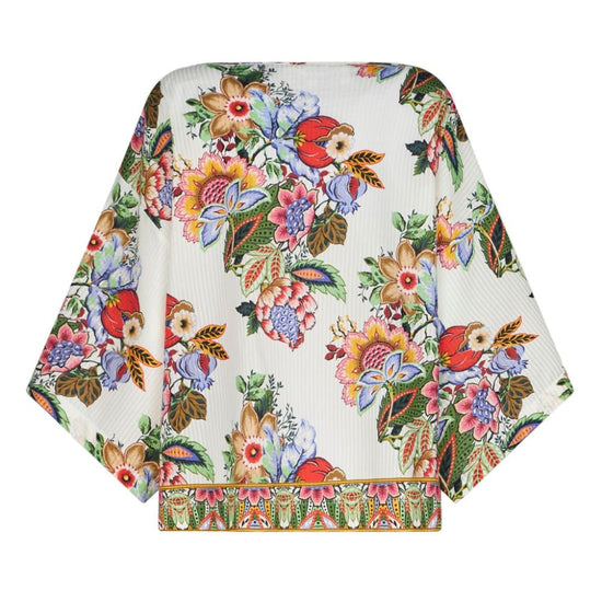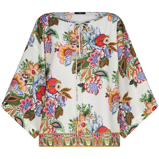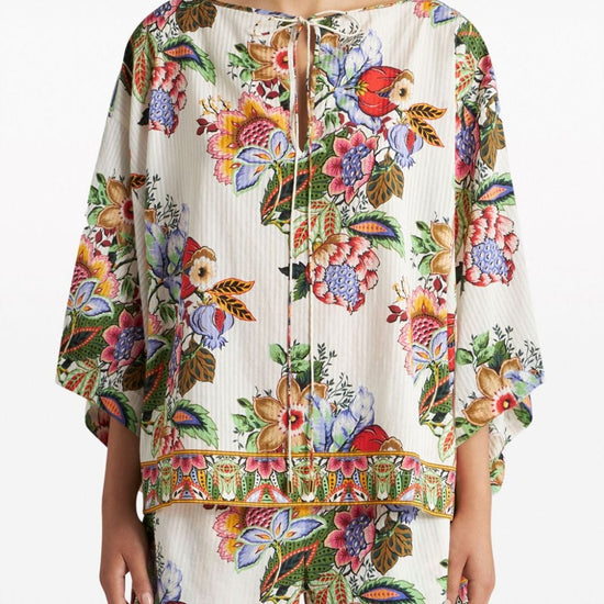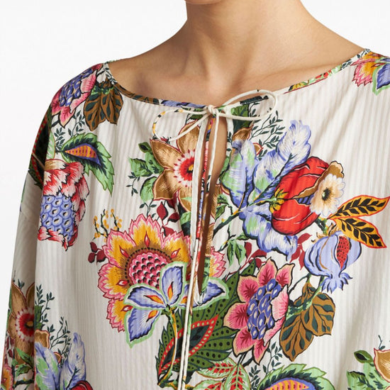 White/multicolour vertical stripe pattern floral print gathered tie neck three-quarter length wide sleeves straight hem cotton and silk blend top size and fit - this piece fits true to size. we recommend you get your regular size. model is 1,75m / 5ft 8in wearing size 40 (it)