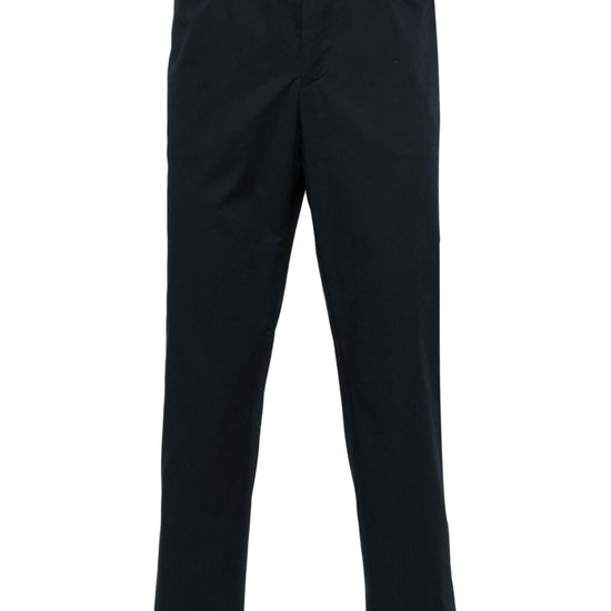 Navy blue stretch-cotton slim cut tapered leg belt loops two diagonal pockets to the sides two rear button-fastening pockets front button and zip fastening cotton trousers size and fit - this piece fits true to size. we recommend you get your regular size. model is 1,84m / 6ft 1in wearing size 48 (it)