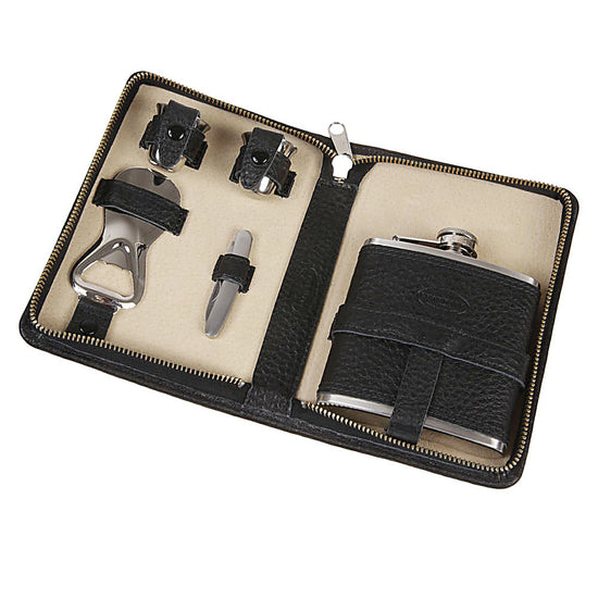 Must-have for travelling: hunting set made from soft, naturally dyed chervo calfskin. lining in black suede. set includes: flask made of stainless steel (150 ml), 2 cups, bottleopener, knive. jagd set leather hunting set