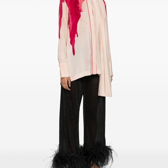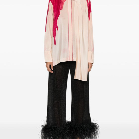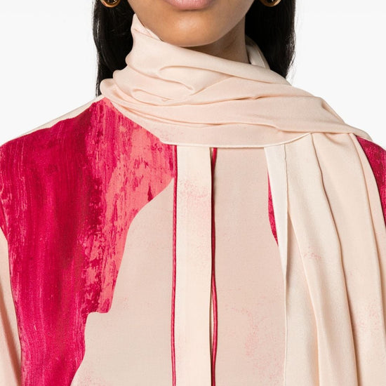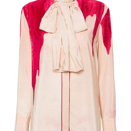 Light pink silk palm tree print detachable long scarf band collar concealed front button fastening long sleeves buttoned cuffs side slits straight hem printed crepe de chine shirt size and fit - this piece fits true to size. we recommend you get your regular size. model is 1,75m / 5ft 8in wearing size s