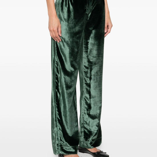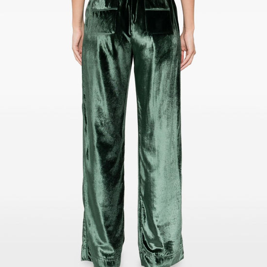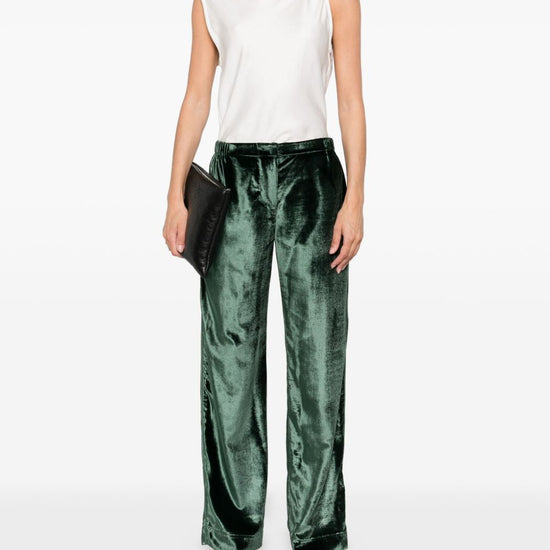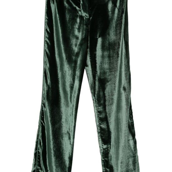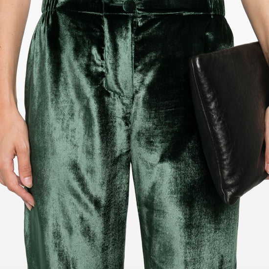 Green velvet trousers, zip and button fastening, two patch pockets on the back, relaxed fit, straight hem. velvet high-waisted trousers