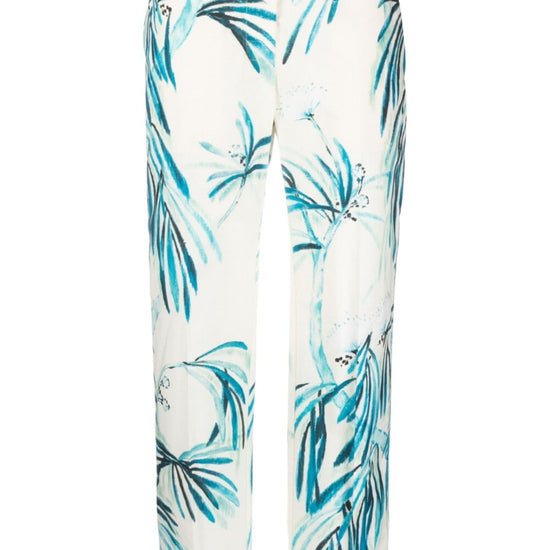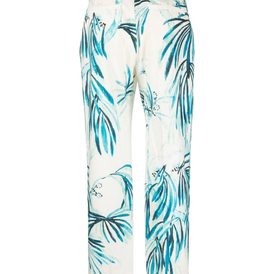 Mid-rise straight-leg trousers from f.r.s for restless sleepers featuring ivory white, cotton, leaf print, concealed fly and button fastening, side slits, mid-rise, belt loops, straight leg and straight hem. wide-leg printed cotton trousers size and fit - this piece fits true to size. we recommend you get your regular size. model is 1,75m / 5ft 8in wearing size s