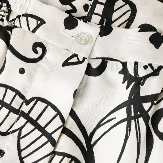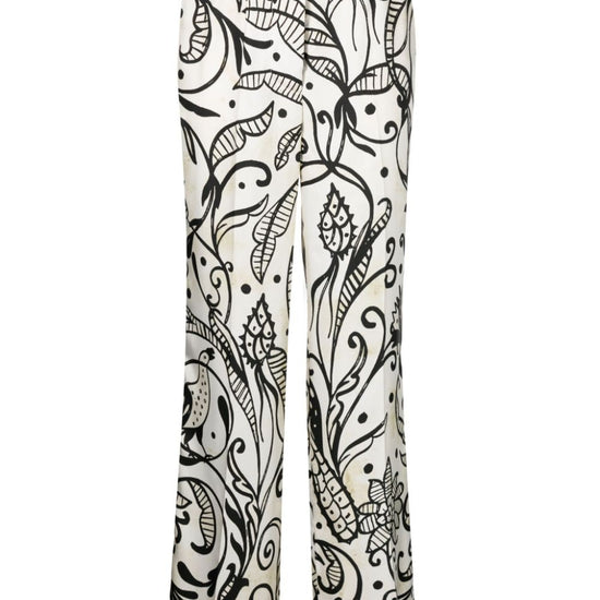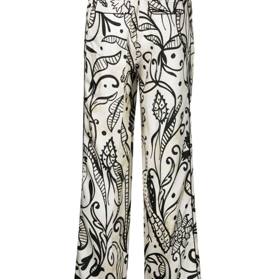 Palazzo silk pyjama trousers from f.r.s for restless sleepers featuring white/black, silk, all-over floral print, elasticated waistband, button fastening and palazzo design. printed silk trousers size and fit - this piece fits true to size. we recommend you get your regular size. model is 1,75m / 5ft 8in wearing size s