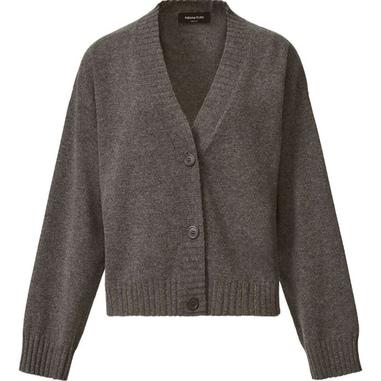 Dark grey v-neck front button fastening long sleeves ribbed hem metallic threading wool v-necked cardigan
