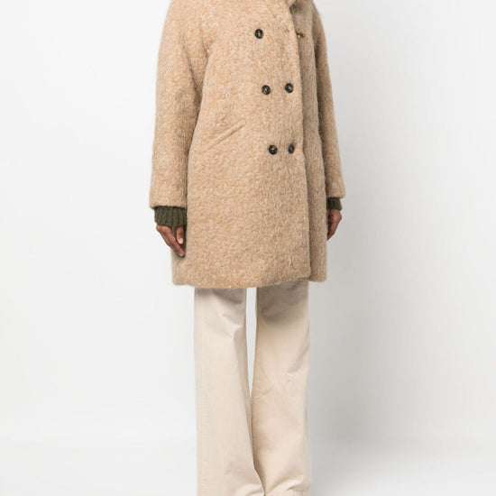 Jacqueline double-breasted coat from fay featuring camel brown, wool blend, gold-tone hardware, spread collar, double-breasted button fastening, hook fastening, long sleeves, slip pockets to the sides and straight hem. double-breasted wool blend coat size and fit - this piece fits true to size. we recommend you get your regular size. model is 1,75m / 5ft 8in wearing size s