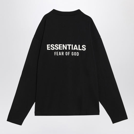 Fear of god essentials black cotton sweater, featuring long sleeves, dropped shoulders, contrasting logo lettering on the chest and back, and a ribbed crew neck. size and fit - model wears size l model measurements: height: 185 cm chest: 105 cm waist: 85 cm hips: 100 cm