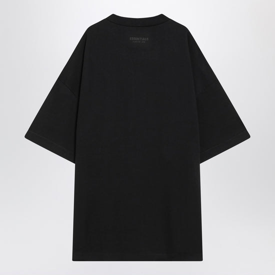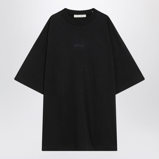 Fear of god essentials black cotton jersey t-shirt, featuring short sleeves, ribbed crew neck, dropped shoulders, rubber logo patch on the chest and tonal logo lettering print on the back. size and fit - model wears size l model measurements: height: 187 cm chest: 100 cm waist: 79 cm hips: 96 cm