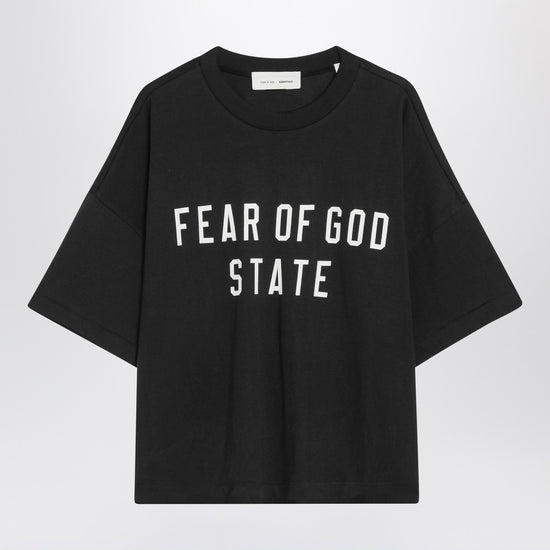 Crewneck t-shirt by fear of god essential in black cotton, featuring contrasting front logo print, logo patch on the back, wide short sleeves and straight hem. size and fit - model wears size s model measurements: height: 182 cm chest: 79 cm waist: 62 cm hips: 90 cm