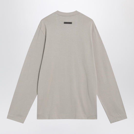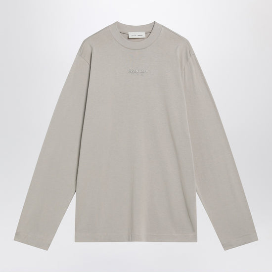 Greige cotton-blend top by fear of god essentials, featuring long sleeves, ribbed crew neck, back logo patch, and raised logo lettering on the front. size and fit - model wears size s model measurements: height: 178 cm chest: 83 cm waist: 63 cm hips: 91 cm