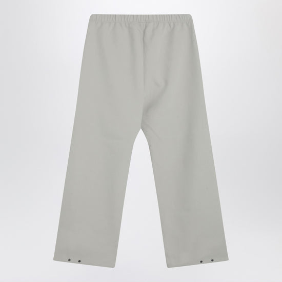 Fear of god essentials grey cotton jogging pants, featuring elastic waistband with drawstring, two side pockets, front rubber logo patch, knee pleats, metal snap buttons at the ankle and relaxed fit. size and fit - model wears size l model measurements: height: 187 cm chest: 100 cm waist: 79 cm hips: 96 cm