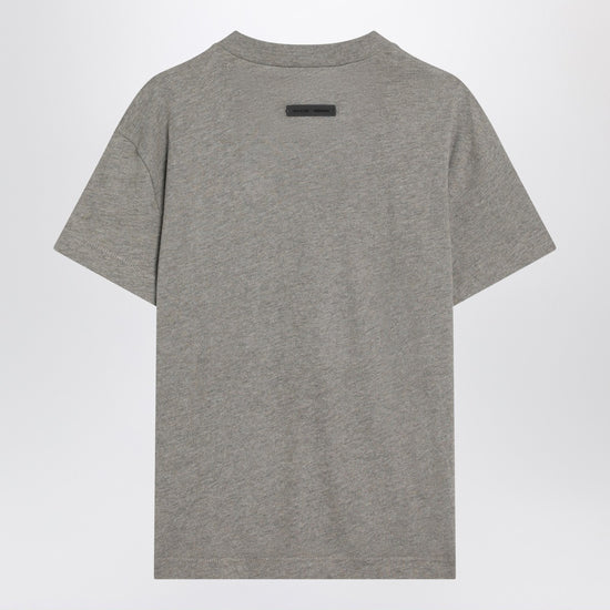 Grey cotton-blend t-shirt by fear of god essentials, featuring short sleeves, ribbed crew neck, back logo patch, and raised logo lettering on the front. size and fit - model wears size s model measurements: height: 178 cm chest: 83 cm waist: 63 cm hips: 91 cm