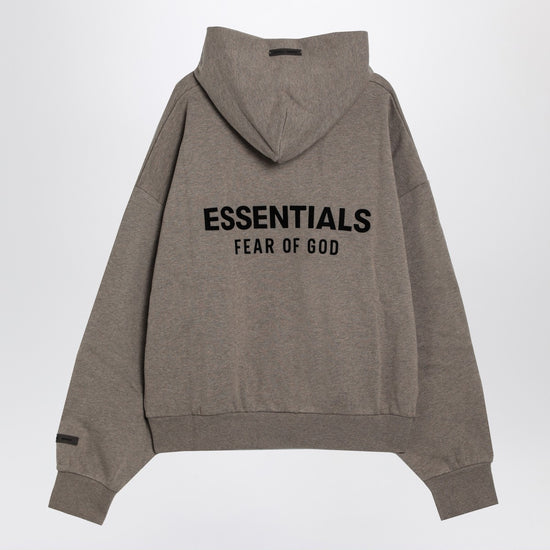 Hooded sweatshirt by fear of god essentials in taupe grey brushed cotton, featuring long sleeves with one having a rubber logo patch on the wrist, dropped shoulders, ribbed edges, a front kangaroo pocket, and contrasting lettering logo on the back. size and fit - model wears size l model measurements: height: 185 cm chest: 105 cm waist: 85 cm hips: 100 cm