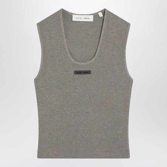 Sleeveless grey cotton-blend tank top by fear of god essentials, featuring wide u-neck, ribbed design, and front logo patch. size and fit - model wears size s model measurements: height: 178 cm chest: 83 cm waist: 63 cm hips: 91 cm