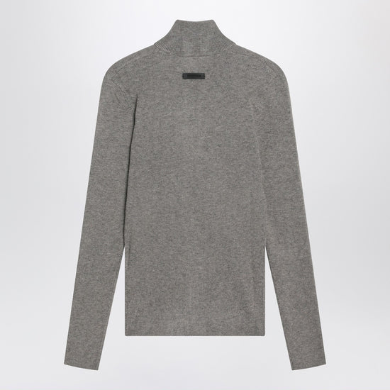 Cardigan by fear of god essentials in grey nylon blend, featuring front double‑zip closure, long sleeves, stand‑up collar, and rear logo patch. size and fit - model wears size s model measurements: height: 178 cm chest: 83 cm waist: 63 cm hips: 91 cm