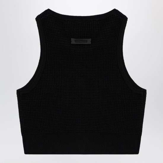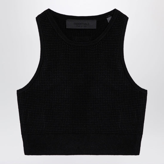 Short crew-neck tank top in black honeycomb by fear of god essentials, featuring rubberized logo patch on the back and ribbed hem. size and fit - model wears size s model measurements: height: 179 cm chest: 82 cm waist: 65 cm hips: 90 cm