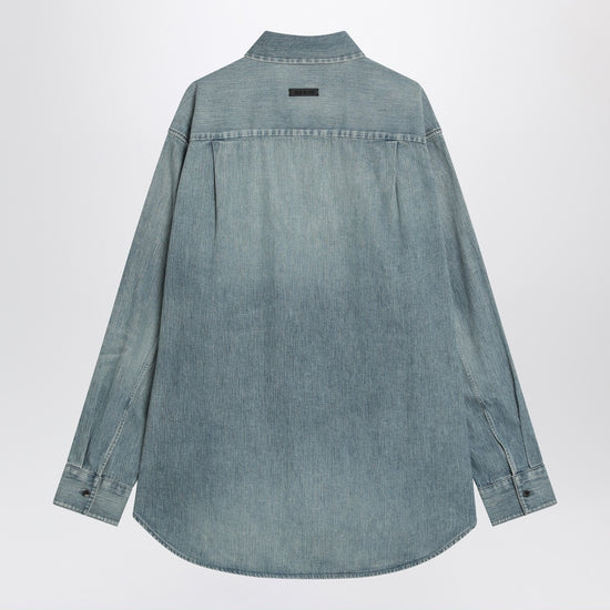 Light blue faded cotton denim shirt by fear of god, featuring hidden front buttoning, long sleeves with buttoned cuffs, classic collar, curved hem, and back logo patch. size and fit - model wears size m model measurements: height: 187 cm chest: 100 cm waist: 79 cm hips: 96 cm
