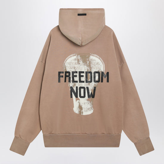 Sweatshirt by fear of god in sand-colored vintage-effect cotton, featuring hood with back logo patch, long sleeves with dropped shoulders, ribbed edges, localized distressing, contrasting “revolution!” front print, back print, and relaxed fit. size and fit - model wears size l model measurements: height: 193 cm chest: 95 cm waist: 78 cm hips: 86 cm