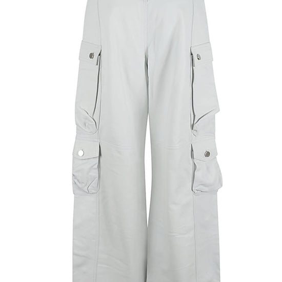 White cargo trousers, side pockets on entmbi figure, zip and button closure, currency pocket, pocket closure with buttons. cargo in pelle leather cargo pants size and fit - this piece fits true to size. we recommend you get your regular size. model is 1,75m / 5ft 8in wearing size 40 (it)