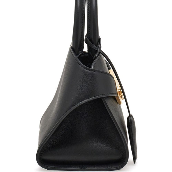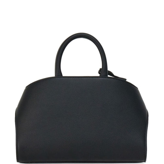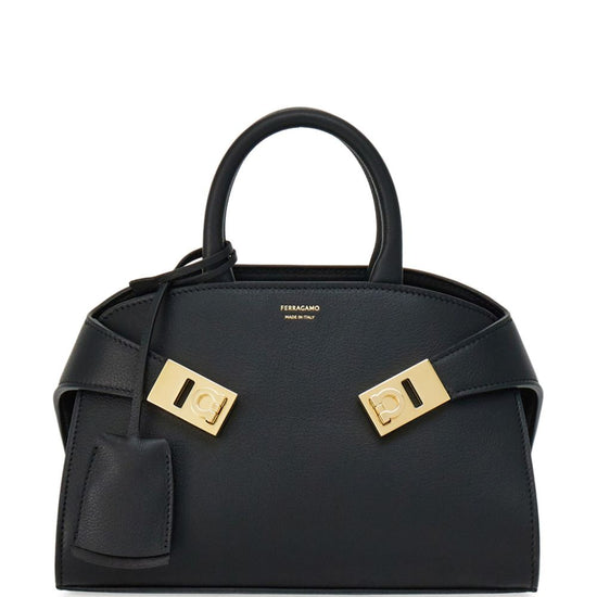 Black calfskin two rolled top handles adjustable detachable shoulder strap clip-lock fastening hanging key fob embossed logo to the front open top main compartment internal card slots leather lining gold-tone hardware hug mini leather handbag size and fit - width 8,66 in / 22 cm height 5,51 in / 14 cm depth 4,33 in / 11 cm.
