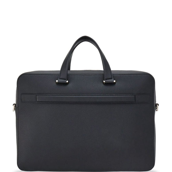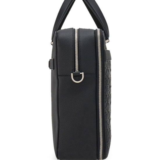 Black calf leather debossed logo to the front all-over embossed logo print top zip fastening two rolled top handles adjustable detachable shoulder strap internal logo patch partitioned compartment gancini leather handbag