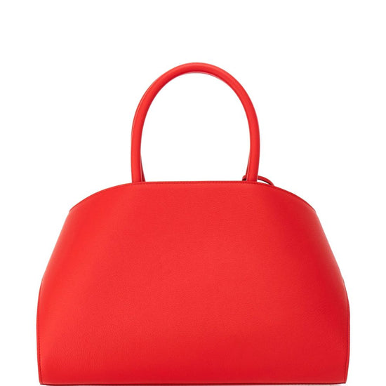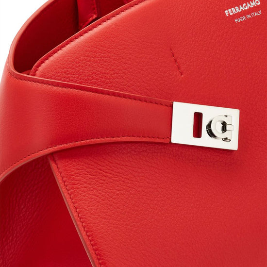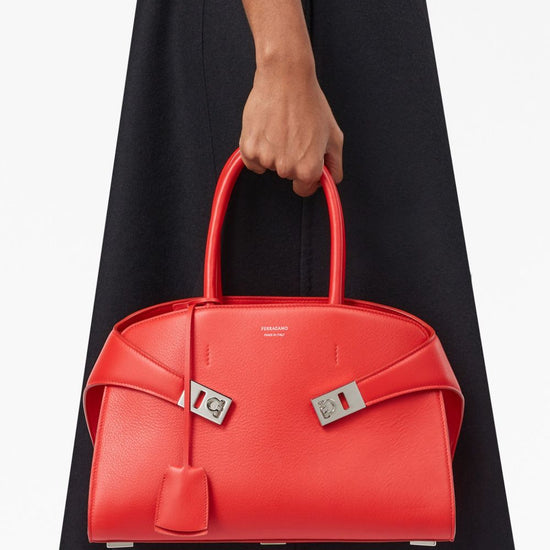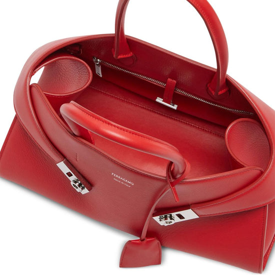 Hug leather tote bag from ferragamo featuring red, calf leather, silver-tone hardware, logo print to the front, main compartment, circular top handles and internal zip-fastening pocket. hug small leahter tote bag size and fit - width 31,5 cm. height 22 cm. depth 19 cm.